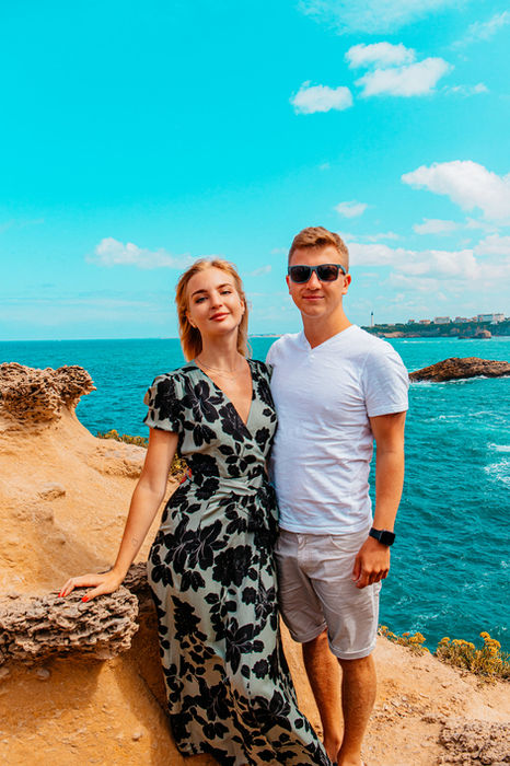 Дівчина на фоні океану і скель у Біарріце, Франція – мальовниче місце для відпочинку на узбережжі